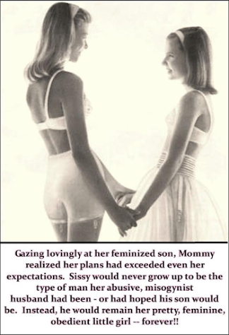 It too was more feminine than my usual plain white one and probably matched the bra. I picked up the yellow shorts which I hadn't seen before and stepped into them. They were a bit bright. With a really short fly and an odd looking button on the waist band. The front was really tight and the back seemed to lift my padded bottom. Just then my wife came in and laughed at my struggles with the shorts. Then it dawned on me. These were woman's shorts and buttoned high on my waist making the fly useless for my anatomy. She reminded me it was useless any way with a pantie girdle. That's when I embarrassed myself, said a lot of things I later regretted after I felt the full force of nature that is my wife. I have never forgotten the sense of shame and pain that receiving that level of correction gave me that morning. Needless to say, I didn't play golf that morning. She held me in her lap, petting me and soothing my emotions until I calmed myself and apologized for my behavior. Then redressed in my new shorts and the salmon collared tee shirt that did nothing to hide the high waist band of the tight yellow shorts, or the lines of my new bra straps.She walked me out to her car and opened the door and seated me painfully and buckle me in. We didn't speak much as she drove. She kept her hand on my bare thigh and gave it a possessive squeeze every now and then. I had no idea where we were going. We stopped outside a row of shops and went into the chemist. She asked if they did ear sleeper piercing. They did. I sat down gingerly in a chair and the lady commented on my red puffy eyes. My wife explained that I had been begging her for piercings and we fought about it. "Looks like she won," the lady said giggling using the feminine pronoun. Which made me turn scarlet and within five minutes, I had been what I thought at the time was marked for life! She held my hand as we walked back to the car. I somehow found the courage to accuse her of just wanting me to be a girl.